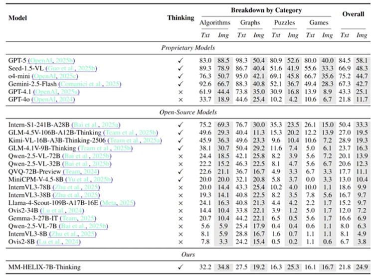 基准测试突破:搭载 MM-HELIX 框架的 Qwen2.5-VL-7B 模型准确率提升 18.6%,超越多个参数量更大的主流模型。